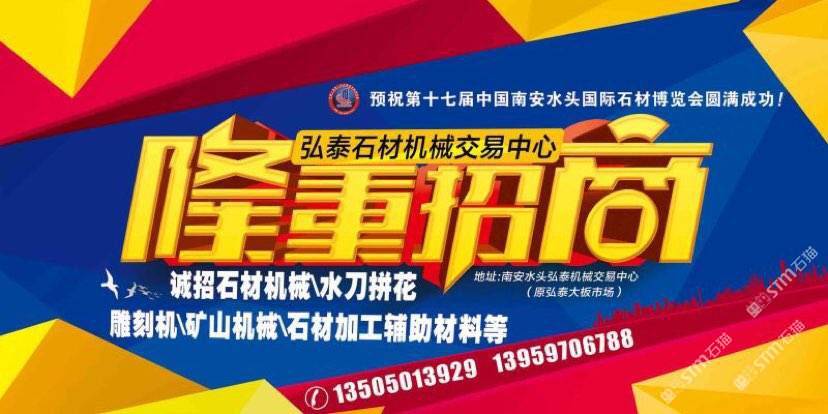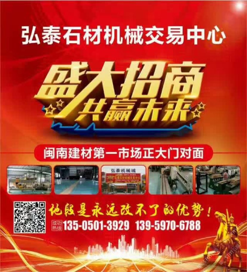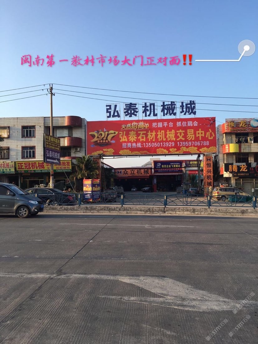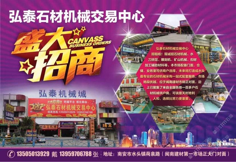 弘泰石材機械交易中心招租啦!現(xiàn)誠招石材機械、水刀拼花、雕刻機、礦山機械、石材加工輔助材料等。本市場配備門面,倉儲,業(yè)務室可供商戶選擇,未來將打造成水頭專業(yè)的石材機械采購一站式配套服務,市場地段優(yōu)越,位于閩南建材市場正對面,邊上已聚集了來自全國各地一百多戶石材機械供戶商,可說是天時地利人和,選擇比努力更重要。