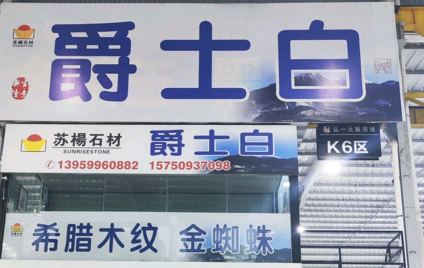 中國福建南安水頭弘一大板市場(chǎng)二期K6區(qū)(爵士白、威尼斯白、金蜘蛛、希臘白木紋、鎏金白玉)