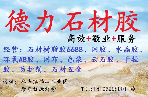經(jīng)營范圍:石材樹脂膠,透明膠,水晶膠,工藝樹脂膠,薄板復(fù)合膠,防水背膠,臺灣AB膠,網(wǎng)布,色漿,防護(hù)劑,意大利進(jìn)口水性AB膠,云石膠,干掛膠,石材色差處理,外墻清洗