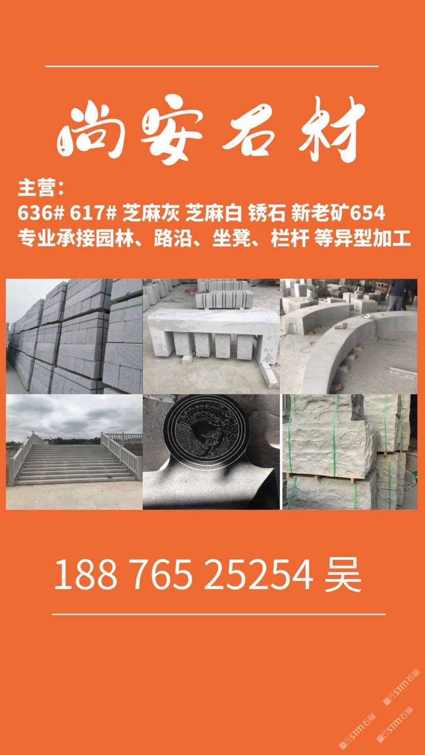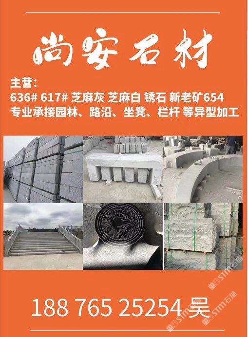 主營(yíng);新老礦芝麻黑 芝麻灰 芝麻白 銹石 636 617 專業(yè)承接 園林地鋪、路沿石、坐凳.欄桿 自然面、菠蘿面、蘑菇石、外墻干掛等異形 厚板加工