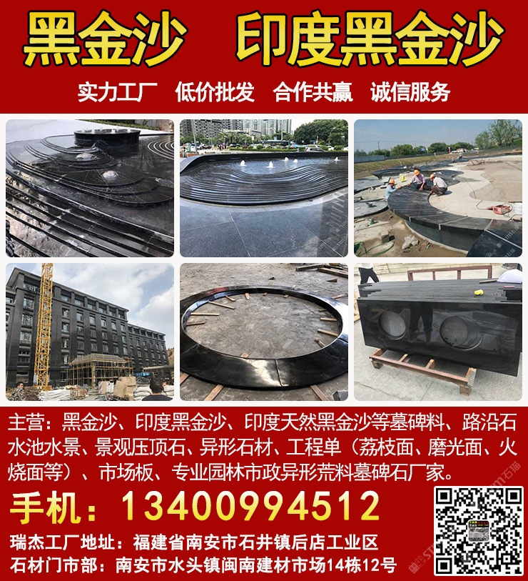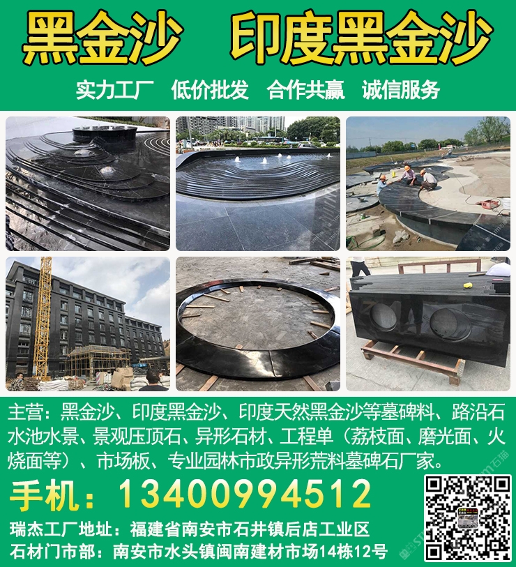 發(fā)布信息: 瑞杰黑金沙林總13400994512專(zhuān)業(yè)印度黑金沙供應(yīng)商,實(shí)力石材工廠主要加工:黑金沙、黑金砂、印度黑金沙、印度天然黑金沙、印度黑色石材、印度黑石、黑金沙石材、黑金沙花崗巖、新礦黑金砂、國(guó)產(chǎn)黑金沙、新黑金沙石材等墓碑料、路沿石、水池水景、景觀壓頂石、異形石材、工程單(荔枝面、磨光面、火燒面等)、市場(chǎng)板、專(zhuān)業(yè)園林市政異形荒料墓碑石廠家,實(shí)力工廠、低價(jià)批發(fā)、合作共贏、誠(chéng)信服務(wù). 工廠地址:福建省南安市石井鎮(zhèn)后店工業(yè)區(qū),門(mén)市部:南安市水頭鎮(zhèn)閩南建材市場(chǎng)