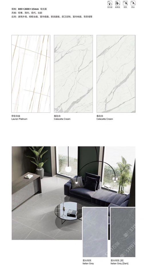 發(fā)布信息: ????SIBELAN 斯貝納巖板???? ????意大利設計師精選巖板???? 我們可以幫老總您加工為成品, 全國范圍內可安排專業(yè)團隊安裝. 做到您一次性采購 省心. 放心. 省時. 低價! 巖板紋路版面全多達199 款 勵志做服務五星的巖板專業(yè)供應商 魚肚白 雪花白 格蘭云天 寒江雪 爵士白 幻影灰 勞倫黑金 火山灰 亞馬遜 艾維拉 羅馬黑檀 貝特巖 細花白 羅馬灰 云朵拉灰 魚肚金 莎羅娜 莎羅蘭 勞倫白金 拉薩白 中花白 灰冰玉 卡拉拉白 撒金黑 清水玉 薩瓦灰 莎士比亞 大花灰 白冰玉 銀灰洞 阿瑪尼灰 綠紋玉 綠冰玉 藍紋玉 保加利亞灰 鐵銹 黑木紋 流砂灰 純白 純灰 純黑 TEL: 15905069590 聶 各種版面規(guī)格全部如下: 1200×600×11mm 啞光 1500×800×11mm 啞光 1800×900×11mm 啞光 1800×900×12mm 啞光 2600×800×15mm 啞光 2400×1200×6mm 啞光/亮光 2400×1200×9mm 啞光/亮光 2400×1200×15mm 啞光 2700×1200×6mm 啞光/亮光 2700×1600×12mm 啞光/亮光 3200×1600×6mm 啞光/亮光 3200×1600×12mm 啞光/亮光