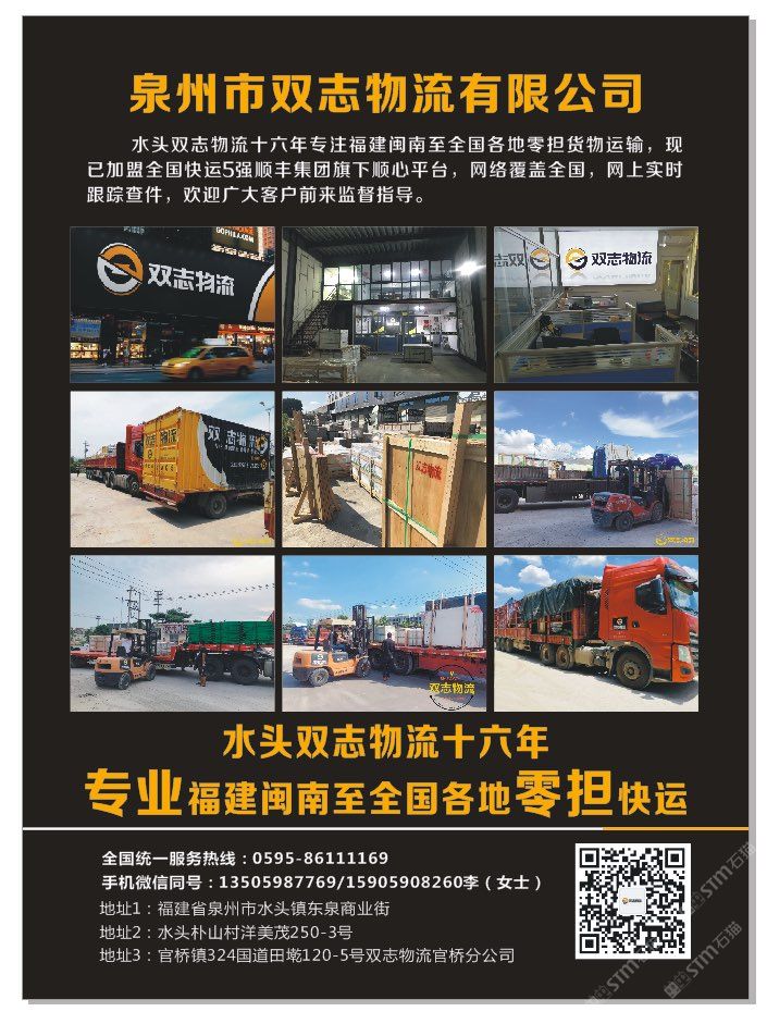 發(fā)布信息: ??【雙志物流】成立于2004年專業(yè)福建閩南至全國石材、瓷磚、巖板、背景墻、機(jī)械設(shè)備等零擔(dān)往返快運倉儲配送貨物運輸!大泉州地區(qū)同城一日達(dá)物流運輸,水頭、官橋、晉江三個倉儲中心打造大泉州同城智慧物流。歡迎廣大客戶監(jiān)督指導(dǎo)合作共享! 零擔(dān)天天發(fā)車,隨時可提貨!?????? 歡迎新老朋友來電咨詢 手機(jī)微信同號? 整車熱線:15905908260 零擔(dān)熱線:18314695339