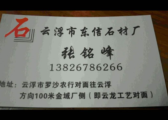 云浮東信石材 聯(lián)系人:張銘峰    138****6266 查看 手機(jī)號(hào)碼:無 主營范圍: 大板批發(fā)、 企業(yè)地址:廣東云浮羅沙農(nóng)行對(duì)面往云浮方向100米金域廠側(cè)