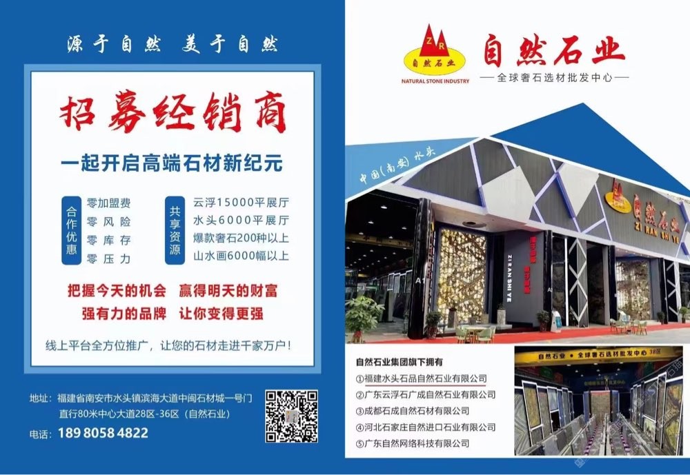 發(fā)布信息: 自然石業(yè)全球奢石批發(fā)中心,招募經(jīng)銷商,無需加盟費(fèi),一手貨源,專業(yè)背景墻供應(yīng)廠家。歡迎選購 ??19305059488(微信同號(hào)) 主營:潘多拉,新款潘多拉,藍(lán)絲綢,紅絲綢,絲綢之路,魅力人生,蒂芙尼,卡拉白,魚肚白,魚肚灰,盛世紅顏,紅寶石,石榴紅寶,桃李春風(fēng),金枝玉葉。金玉滿堂,金孔雀,孔雀開屏,火樹銀花,潘多拉,維也納,亞馬遜綠,綠翡翠,加雅綠,白色羅馬,藍(lán)色羅馬,羅馬印象,海納百川,春山畫境,冰河世紀(jì),波光靈動(dòng),金戈壁玉,天澤玉石,鉑金鉆,翰墨白金,景泰藍(lán),皇家藍(lán),白銀狐,雪山銀狐,雪山蘭,雪山藍(lán),雪山白,山水畫,煙影流香,藍(lán)水晶,紫水晶,加爾達(dá)之晶,龍文綠,竹節(jié)綠,綠斑竹,紫氣東來,千里馬,藍(lán)色精靈,壁山芳華,格蘭云天,香格里拉,夢(mèng)幻藍(lán)寶,海洋之星,綠野仙蹤,藍(lán)翡翠,自然白,羅馬灰,白底潘多拉等產(chǎn)品!有單你來談,價(jià)格好商量! 中閩石材城28區(qū)-36區(qū)(一號(hào)門直走一百米左手邊)