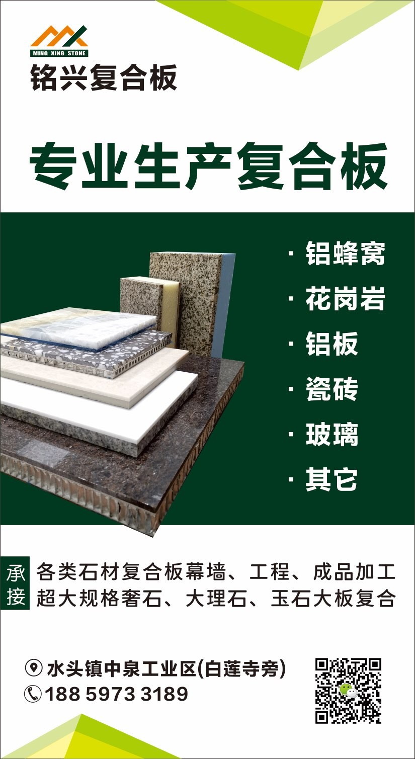 發(fā)布信息: 【銘興復合板】專業(yè)加工各類石材復合板 1.承接大理石/花崗巖復合板工程、幕墻! (鋁蜂窩板、花崗巖、瓷磚,玻纖蜂窩板,人造石、玻璃等) 2.各類超大規(guī)格石材復合板(3800×2100) 供應各類石材復合板成品,來料代加工!