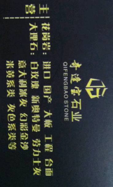 奇逢寶石業(yè)有限公司 聯(lián)系人:蔡美女    134****8588 查看 188****6766 查看 主營(yíng)范圍: 大板批發(fā)、大理石加工、 企業(yè)地址:福建泉州南安市奎峰路華輝大板市場(chǎng)G07