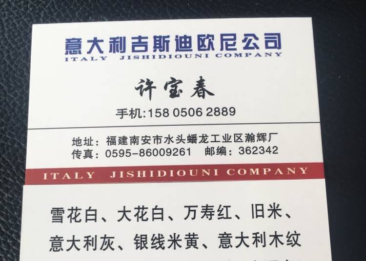 意大利吉斯迪歐尼公司 聯(lián)系人:許女士    159****0168 查看 158****2889 查看 主營范圍: 大板批發(fā)、荒料、 企業(yè)地址:福建南安水頭鎮(zhèn)蟠龍工業(yè)區(qū)瀚輝廠