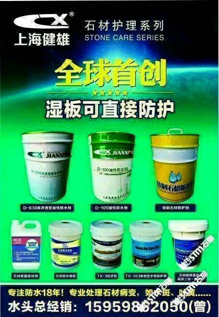 發(fā)布信息: 需要做防水的找我哦!主營(yíng):水性防水劑,油性防護(hù)劑(濕板直接防水,質(zhì)量超級(jí)好!),花崗巖除銹劑(超級(jí)好用,不會(huì)再反銹),大理石除黃劑,花崗巖增色增艷劑!水斑劑等等!咨詢電話??15959862050